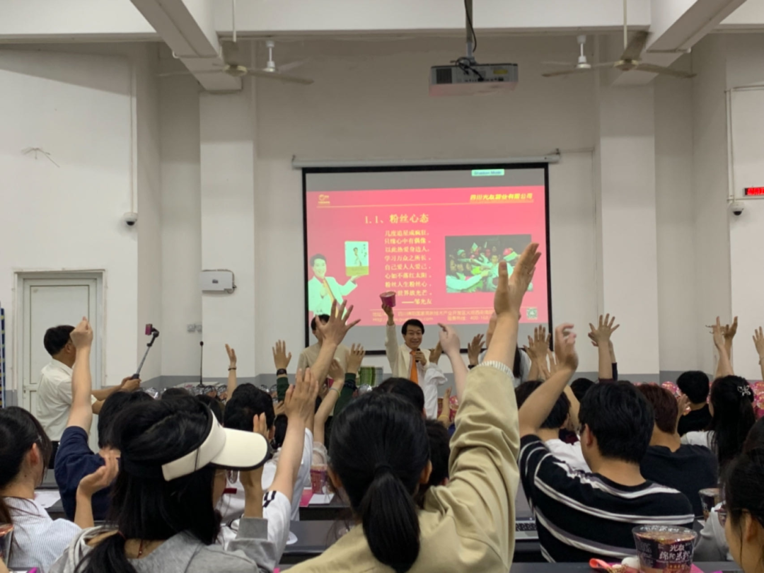 大家都踴躍地加入到活動(dòng)當中,一個(gè)個(gè)同學(xué)接連勇敢走上舞臺,與光友薯業(yè)董事長(cháng)鄒光友熱情交流互動(dòng)。許多學(xué)子登臺共跳光友粉絲舞,現場(chǎng)氣氛徹底點(diǎn)燃。