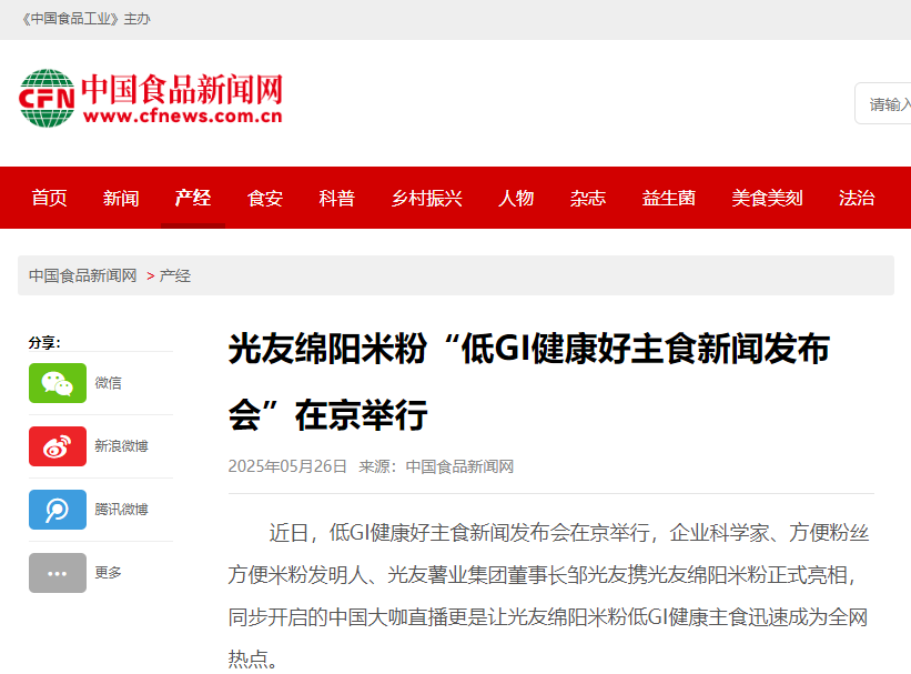 轉載中國食品新聞網(wǎng)——光友綿陽(yáng)米粉“低GI健康好主食新聞發(fā)布會(huì )”在京舉行